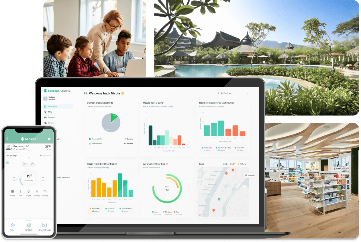 Soluțiile Sensibo îți oferă control complet asupra aerului condiționat, monitorizare în timp real și automatizare inteligentă, compatibile cu peste 10.000 de modele de aparate AC, ajutându-te să reduci consumul de energie și costurile operaționale.
