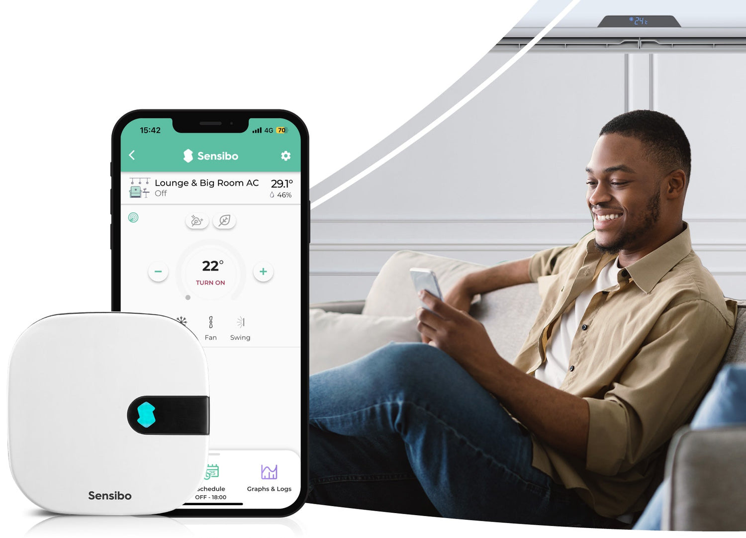 Sensibo îți permite să controlezi aparatul de aer condiționat sau pompa de căldură prin intermediul smartphone-ului, fie că ești acasă, fie departe. Poți ajusta temperatura, schimba setările și seta programe folosind semnale infraroșu care imită telecomanda AC-ului tău prin Wi-Fi. Astfel, orice aer condiționat sau pompă de căldură devine un aparat inteligent.