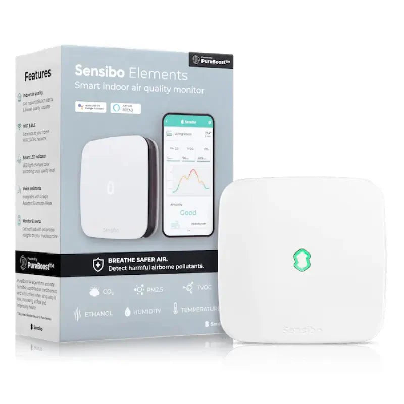 Sensibo Elements este un dispozitiv sofisticat, conceput pentru a monitoriza continuu calitatea aerului din interior. Spre deosebire de un termostat, acest senzor inteligent nu controlează direct aparatele de climatizare, ci se concentrează pe sănătatea mediului din locuința ta. Dispozitivul măsoară diverși poluanți și parametri importanți, precum CO₂, PM2.5, TVOC și Etanol, pentru a te ajuta să respiri un aer curat și sănătos. În plus, monitorizează constant temperatura și umiditatea, asigurând un climat confortabil și prevenind dezvoltarea mucegaiului.
