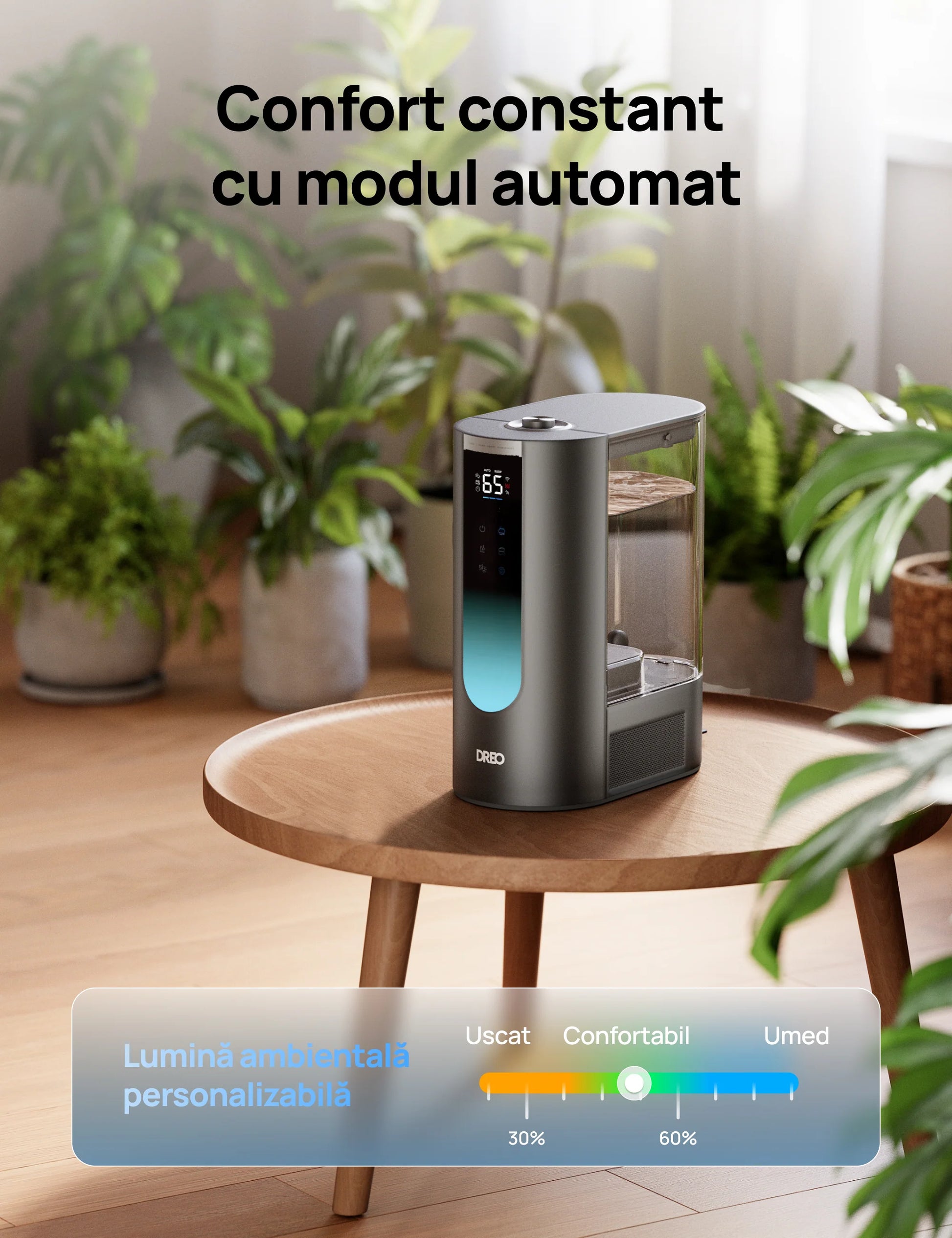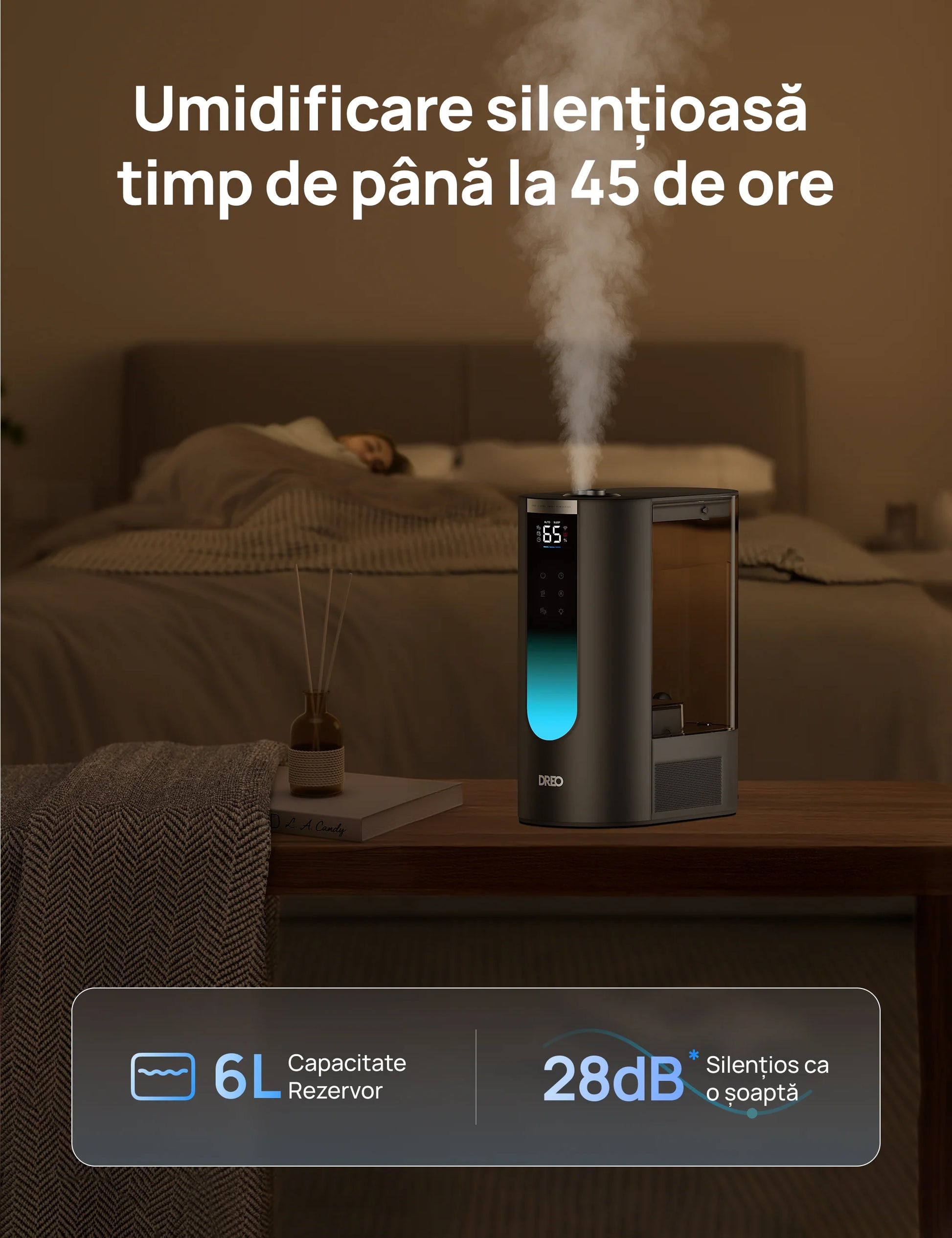 Umidificatorul DREO 813S dispune de un rezervor de 6 litri, permițând o funcționare continuă de până la 60 de ore. Această autonomie extinsă reduce necesitatea reumplerii frecvente, fiind ideal pentru utilizarea pe parcursul întregii zile sau pe timpul nopții.